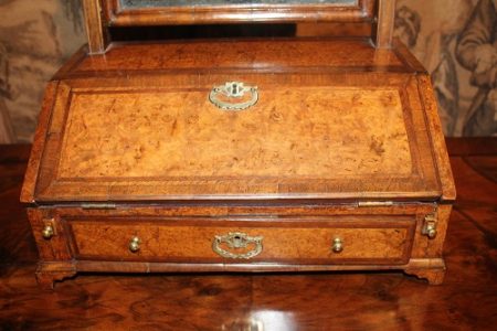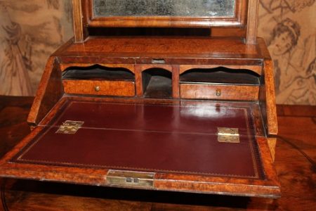 Fitted interior with leather writing surface and two small drawers.