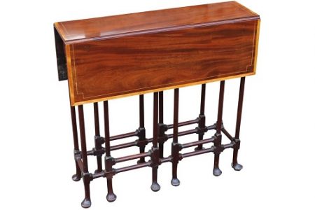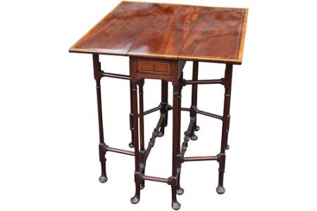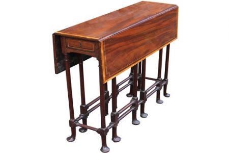 George III Mahogany and Satinwood banded spider leg table with equal size folding flats supported by delicate mahogany legs finishing with fine pad feet with drawers at either end.