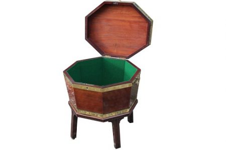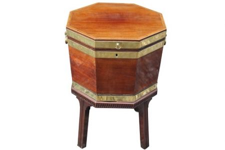 George III Mahogany octagonal brass bound cellaret with cross banding around the top over a slightly tapered body with brass bands and loop handles, above a fluted apron, raised on reeded slightly splayed square legs ending on casters. Inside fitted with baize interior