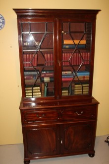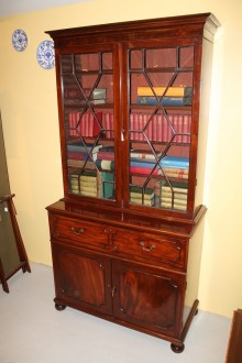 A Mid 19th C Victorian Mahogany Secretaire Bookcase, the moulded cornice above astragal glazed doors opening to shelves over a fall front long drawer with a fitted interior above a pair of panel doors, raised on bun feet.