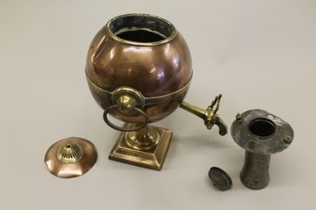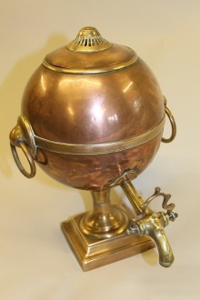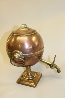 All items can be viewed in person by appointment - please contact us to arrange a viewing. Brass and Copper Toddy Warmer Stock No. - 451 Brass and Copper toddy warmer with inner container for coals, decorative side handles with spout and tap. H29cm W20cm Price: £145