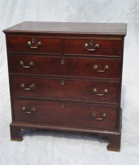 Chestnut country chest of drawers with swan neck handles, two over three graduating drawers with swan neck handles. Good depth of colour on bracket feet.