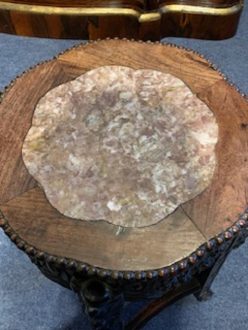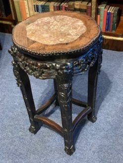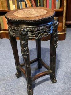 Chinese Hongmu Marble Topped Vase stand Qing dynasty , late 19th Century with pink marble insert raised on pierced and carved scroll legs.