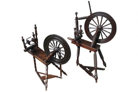 Wonderful unusual fully complete laburnum Scottish spinning wheel with fine ring turnings, treadle foot and wool winder.