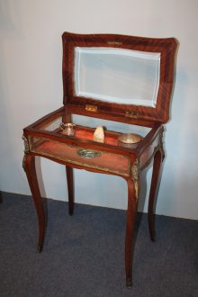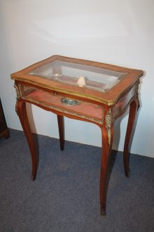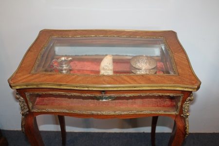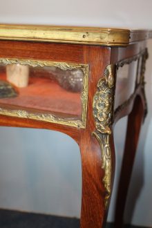 Display cabinet on cabriole legs and brass mounts, the chamfered glass panels have gilt mount around all glass sections. The lid opens and has a red velvet base where ornaments can be displayed.