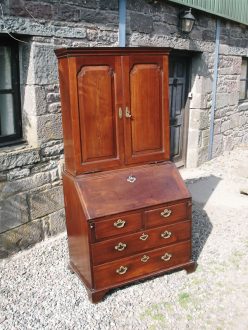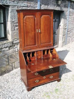 Early 18C mahogany bureau bookcase. Top has solid panel doors with inverted corners and brass pivot hinges with candle slides. Classic interior with pigeonholes and stepped drawer fronts with central door and secret compartment drawers. Original hinges and locks which is unusual.