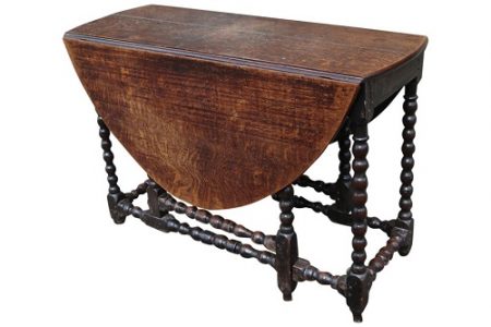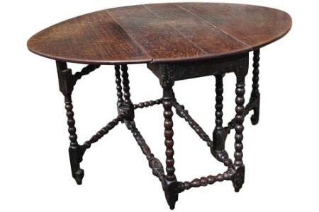 Early 18th century oak gate leg table with bobbin turning and pegged joints, great depth of colour with well figured top show off medullary rays in the quarter sawn oak planks.