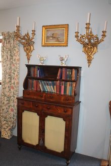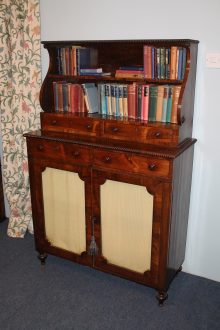Early 19th C Rosewood Chiffonier with super structure, comprising of two drawers and shelved section, yellow silk lined doors with beaded edges, raised on turned legs.