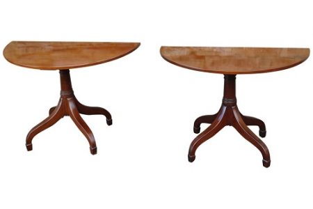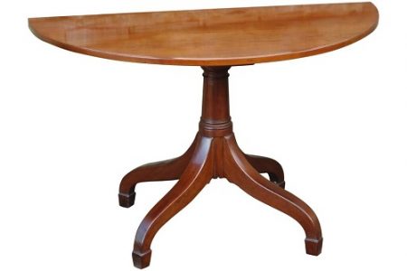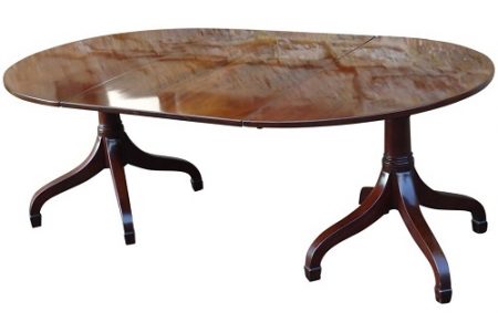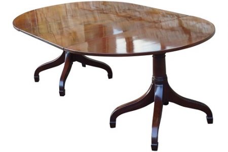 Early Georgian Mahogany dining table with two unusual quadruple pedestals, finishing with a small caster. D end shape with one central leaf and brass clips. The whole table has good depth of colour.