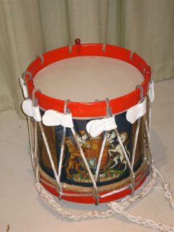 Elizabeth II general service military side drum with body transfer printed coates of arms flanked by battle honours on a blue ground.