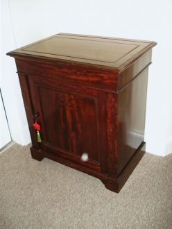 Figured mahogany side cabinet, top lifts up to revealing area for storage, below is a fielded panel door with on shelf inside, raised on cut out plinth base.