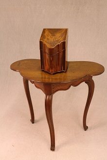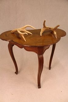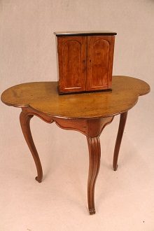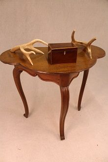 All items can be viewed in person by appointment - please contact us to arrange a viewing. French Oak Side Table Stock No. - 1301 Unusually shaped French Oak sidetable with pegged construction and three moulded cabriole legs finishing in cerved turned out feet.W88cm H79cm D 53cm Price: £280