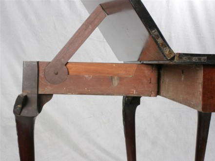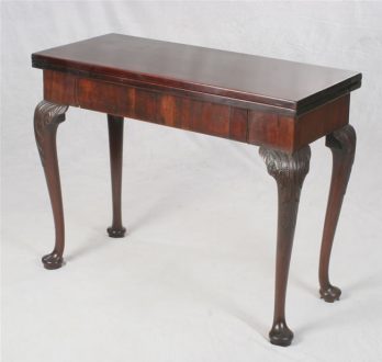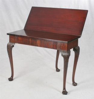 George II mahogany tea table with finely carved cabriole legs finishing with a pad foot and hidden sunk castors. Fly leg has an unusual top strut which lifts up to support the top when open. Wonderful deep colour.