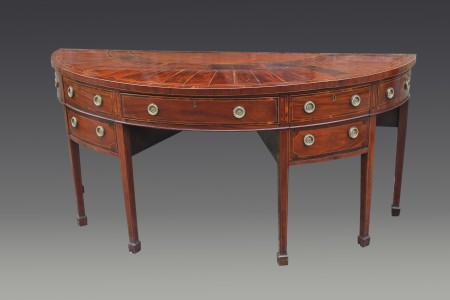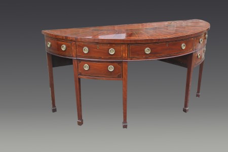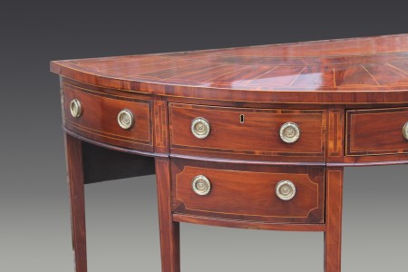 Mahogany George III bow front sideboard with boxwood stringing decoration. Highly worked top with contrasting figured mahogany veneers separated with boxwood tinging and cross band edge. One central triangular shaped drawer flanked by two deep drawers with drawer cupboards at the back, brass ring handles. Robust square tapered legs finishing with spade feet.