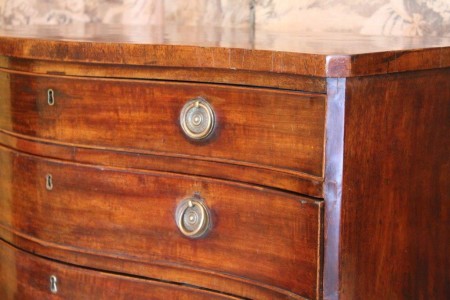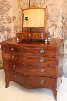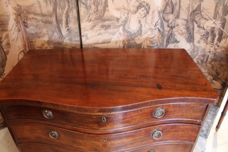 All items can be viewed in person by appointment - please contact us to arrange a viewing. George III Mahogany Serpentine Chest Stock No. - 374 George III Mahogany Serpentine ChestThe four long graduated drawers within the canted angles, on splayed bracket feetW98.5 D56cm H84.5C1770 Price: £1650