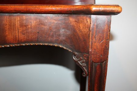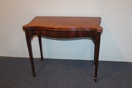 George III Mahogany fold over Serpentine Tea Table. The serpentine top with moulded edge above a frieze with rope twist moulding raised on channel moulded square tapered legs ending in toupee feet.