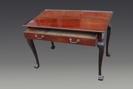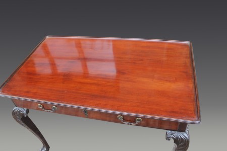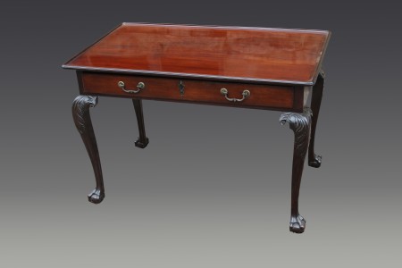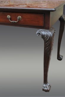 George III Mahogany silver table with rectangular dished top over a long frieze drawer raised on acanthus carved cabriole legs ending in claw and ball feet.