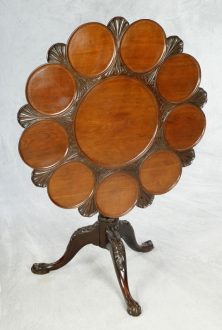 George III mahogany Supper table, the top in the form of ten dishes with radiating carvings. The tri pod base has wonderful carved knees with the image of a man and moustache, terminating with egg and claw foot.