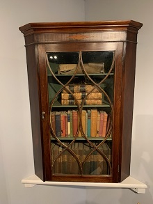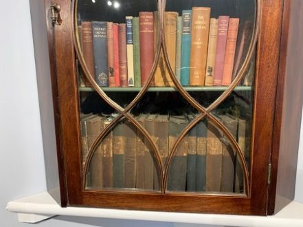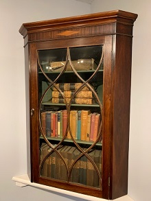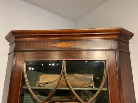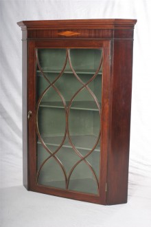 Glazed Mahogany George III corner cabinet with boxwood inlay. Moulded cornices with single lozenge decoration on freeze, unusual decorative glazing bars.