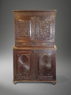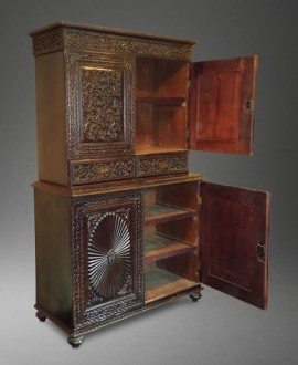 An exceptional Indian highly carved decorative two part cabinet with two drawers made completely from Teak which is very unusual, fitted with inner shelves and raised on turned feet.