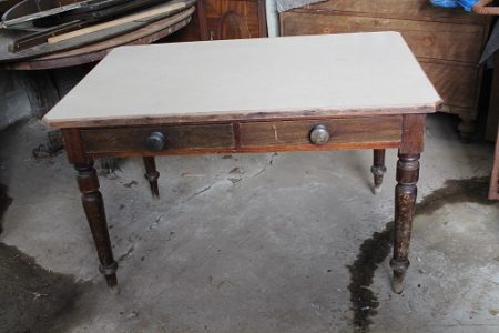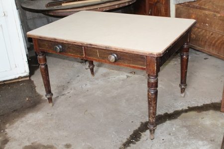 All items can be viewed in person by appointment - please contact us to arrange a viewing. Kitchen table with formica top Stock No. - 458 Kitchen table with formica top with canted corners on turned legs. Two lower drawers. W124cm D82cm H76cm Price: £220