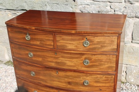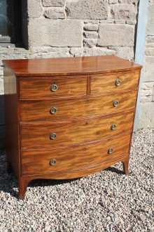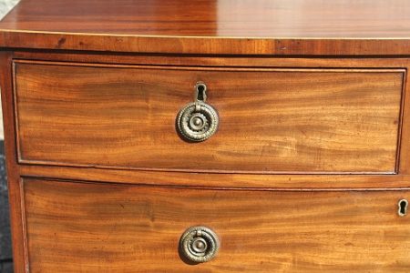 Beautifully figures Mahogany bow fronted chest of drawers with splayed legs, good colour and boxwood stringing decoration. Brass round ring handles. It has an oak lined drawer runner which is always a good sign of quality.