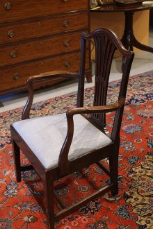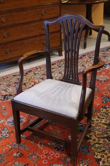 All items can be viewed in person by appointment - please contact us to arrange a viewing. Mahogany Carver Chair with drop in seat Stock No. - 590 Mahogany Carver with blue covered drop in seat W 67cm D 47cm H (to seat) 45cm H ( to top) 99cm Price: £260
