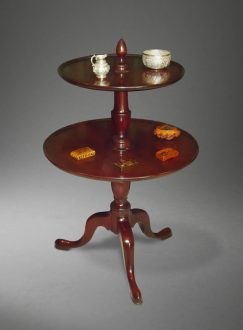 Mahogany two tier dumb waiter with lipped edge and nicely turned central column raised on elegant tripod base and has good depth of colour. The second shelf has been broken at some point. (The whole piece can be dismantled)