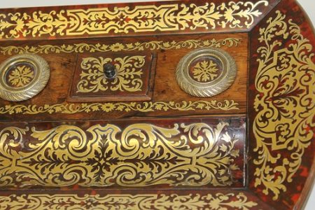 Napoleon III Boulle inkwell with pen tray and tops for ink and sand. A good example with intricately cut marquetry in tortoiseshell and brass.