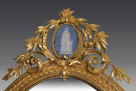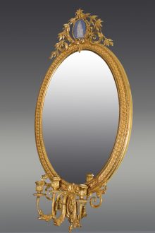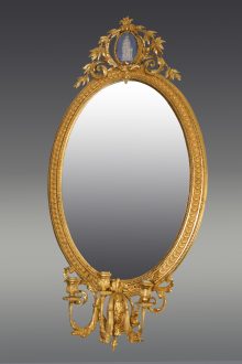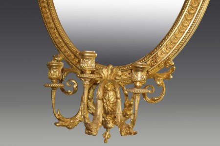 All items can be viewed in person by appointment - please contact us to arrange a viewing. Neo Classic gilt mirror Stock No. - 499 Neo Classic gilt mirror with candle sconces and decorative moulded decorations W 62cm D 5cm H 127cm Price: £1250