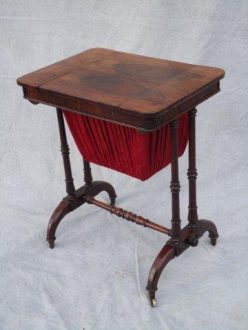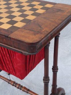 Nineteenth century rosewood games table, the rectangular top with sliding central section, the reverse with games board above slide out bag, on four tapered cylindrical supports and down swept legs terminating in brass caps and casters united by turned stretcher.