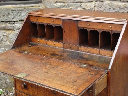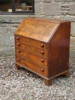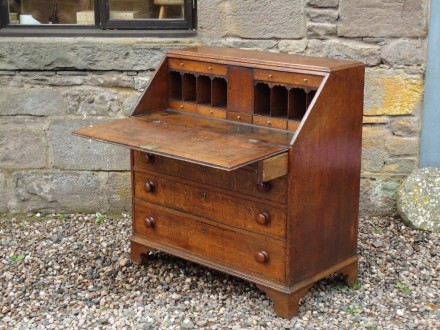 Oak country bureau with well fitted interior, four long drawers with knob handles. Raised on bracket feet and well figured oak with medullary rays