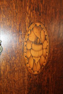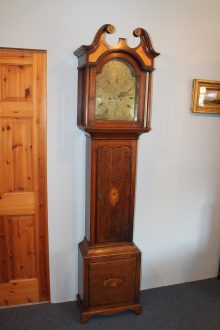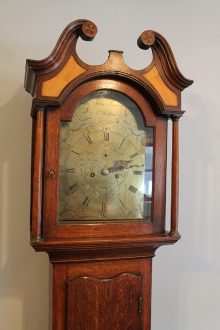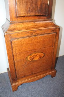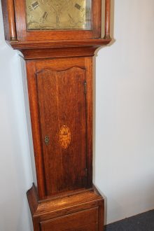 Elegant oak longcase clock with swan neck pediment and marquetry embellishments on trunk door and base. The face is brass with makers name inscribed “ John Brown – St Andrews”