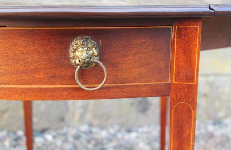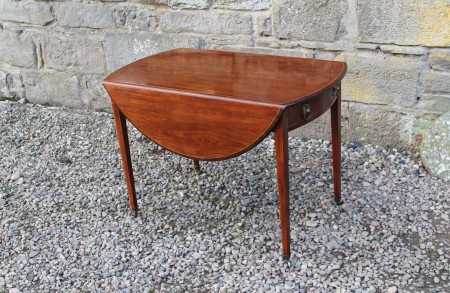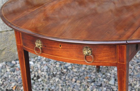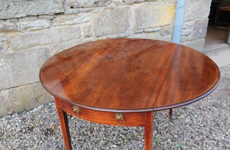 Good quality oval mahogany Pembroke table with cross banded decoration around top, one working drawer with oak linings and inlaid square tapering legs finishing with brass caster.