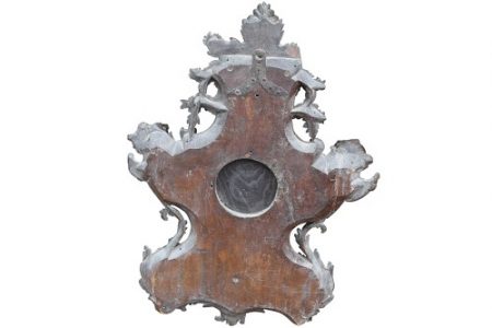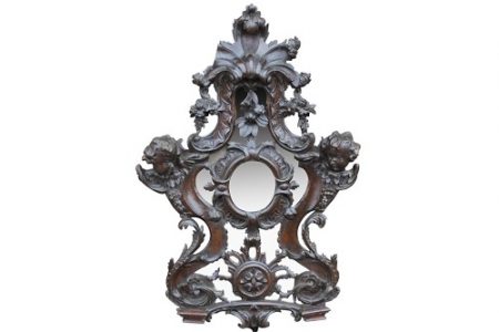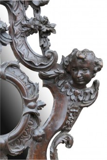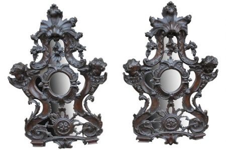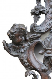 Pair of 18th C carved Baroque wall mirrors with carved scrolls, foliate and putti masks. Wonderful depth of colour and excellent carving.