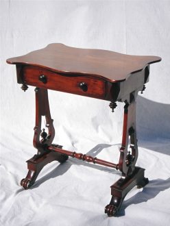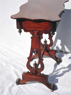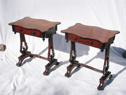 Pair of cedar & mahogany side tables with waved tops, above shallow frieze drawer. Supported on lyre trestles with turned stretcher and scrolling feet. American cabinetmaker.