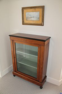 Pair of late 19thC Walnut and Inlaid cabinets each with glass door and blue fabric lined interior with ebonised top moulding and turned feet.