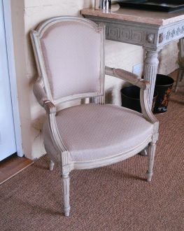 Pair of Louis XVI painted Fauteuils each with arched backs, padded scroll arms and stuff over seats covered in patterned pale green fabric raised on stop fluted turned tapered legs.