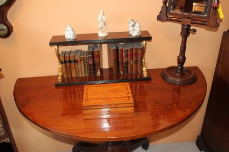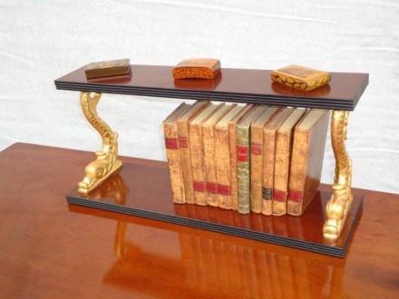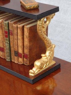 All items can be viewed in person by appointment - please contact us to arrange a viewing. Pair of Regency Mahogany Bookstands Stock No. - 346 Elegant pair of Regency mahogany bookstands with ebonised reeded edge and gilt carved dolphin supports.W58cm H26cm Price: £750