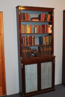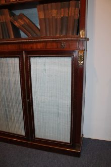 Pair of Regency rosewood and gilt metal mounted bookcases. Straight cornices over pale blue silk backed open bookcase with three adjustable shelves lined with brass bead moulding and lower parts with dummy frieze drawers over pair of doors lined in matching pale blue silk, opening to further adjustable shelves, om plinth bases.
