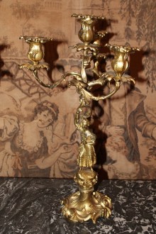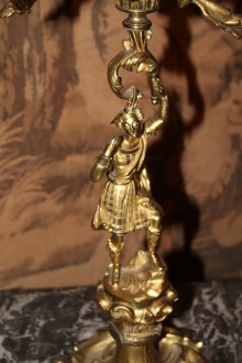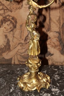 Pair of Scottish Victorian gilt figural candelabras each with central arm and three foliate scroll candle arms with bun form nozzles and leaf cast drip pans held aloft on stems modelling as Scottish man and woman in Highland dress on spreading Rococo base.