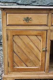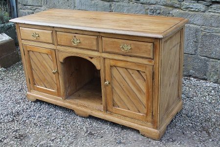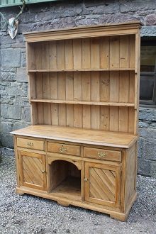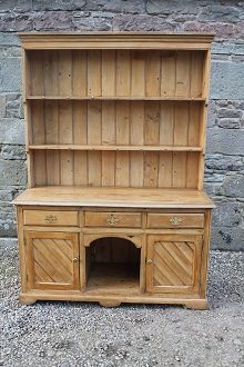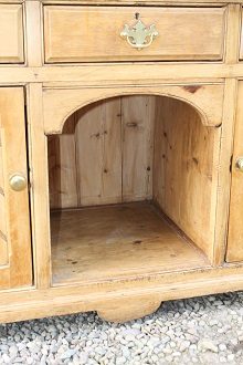 19th Century Pine Kitchen Dresser with three lower drawers over two cupboards with open void in the centre raised on plinth base. Plate rack above. C1900