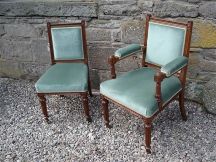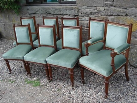 Set of eight walnut and finely carved dining chairs including one arm chair. Upholstered backs and seats in green material.