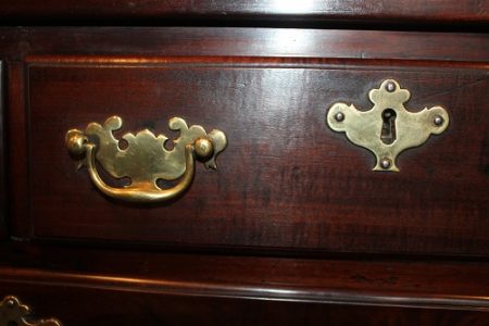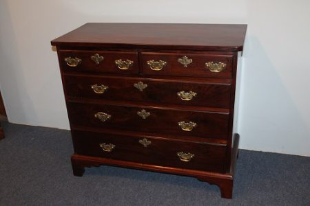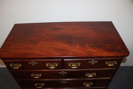 Small Early Georgian Chest with mahogany flame figured top, two small drawers over three graduating drawers with solid brass plate handles raised on bracket feet.