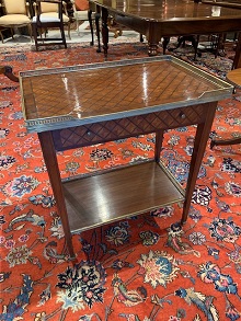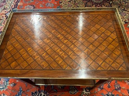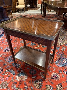 Louis XVI style small parquetry designed top and frieze drawer lipped with brass gallery. Square tapering legs, finishing with brass caps.