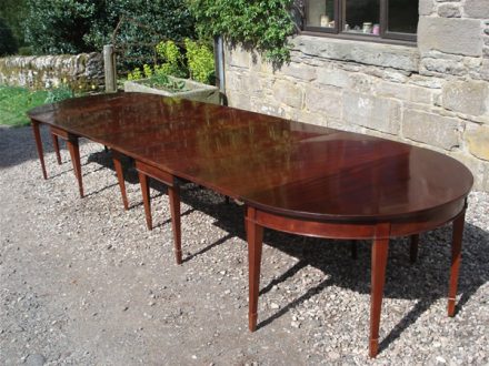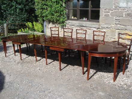 Very large Mahogany Georgian dining table with two D ends, pair of matching centre sections with two fixed folding down leaves and gate-leg action fly legs.