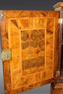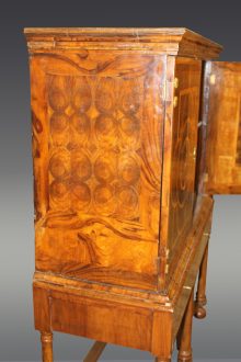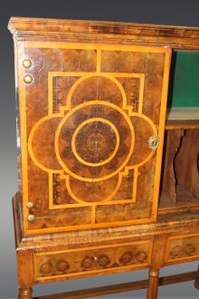 William and Mary oyster veneered cabinet on stand, late 17th Century. Moulded cross grain cornice above a pair of oyster veneered doors opening to shelved and compartmented interior. Wonderful veneer workmanship made more than 300 years ago, beautiful design technique and it would make any room interesting. Could easily be used for modern day functions.